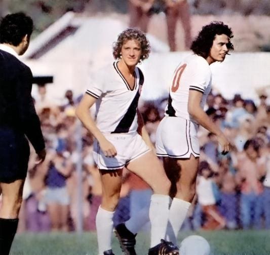 Veja a imagem de Zanata e Roberto Dinamite durante uma partida do Vasco em 1975.