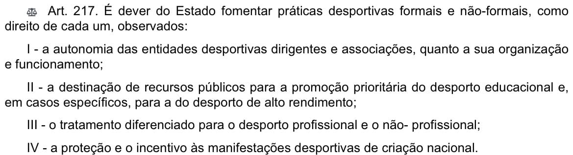 Procurador do STJD propõe alteração na CBF e menciona o artigo 217 da Constituição Federal: ‘É apenas um descontentamento passageiro, sem qualquer prejuízo’ sexta-feira, 11/10/2024 às 13:47 — Em Últimas notícias