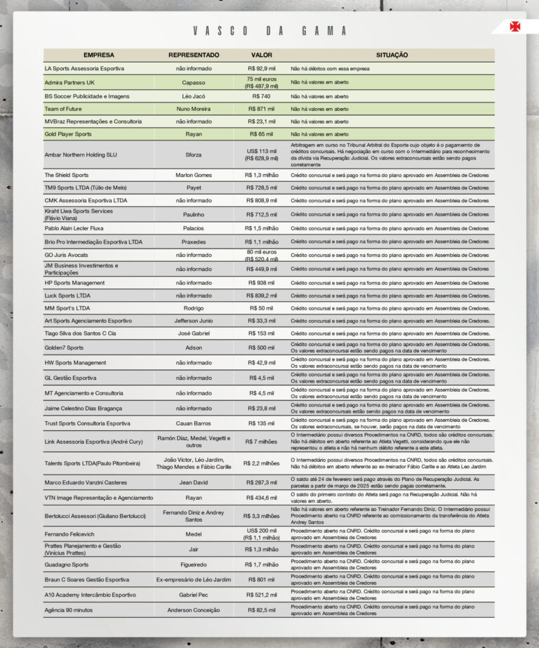 O Vasco contesta a dívida de mais de R$ 30 milhões em comissões a agentes. Confira a tabela com detalhes e observações sobre o caso!