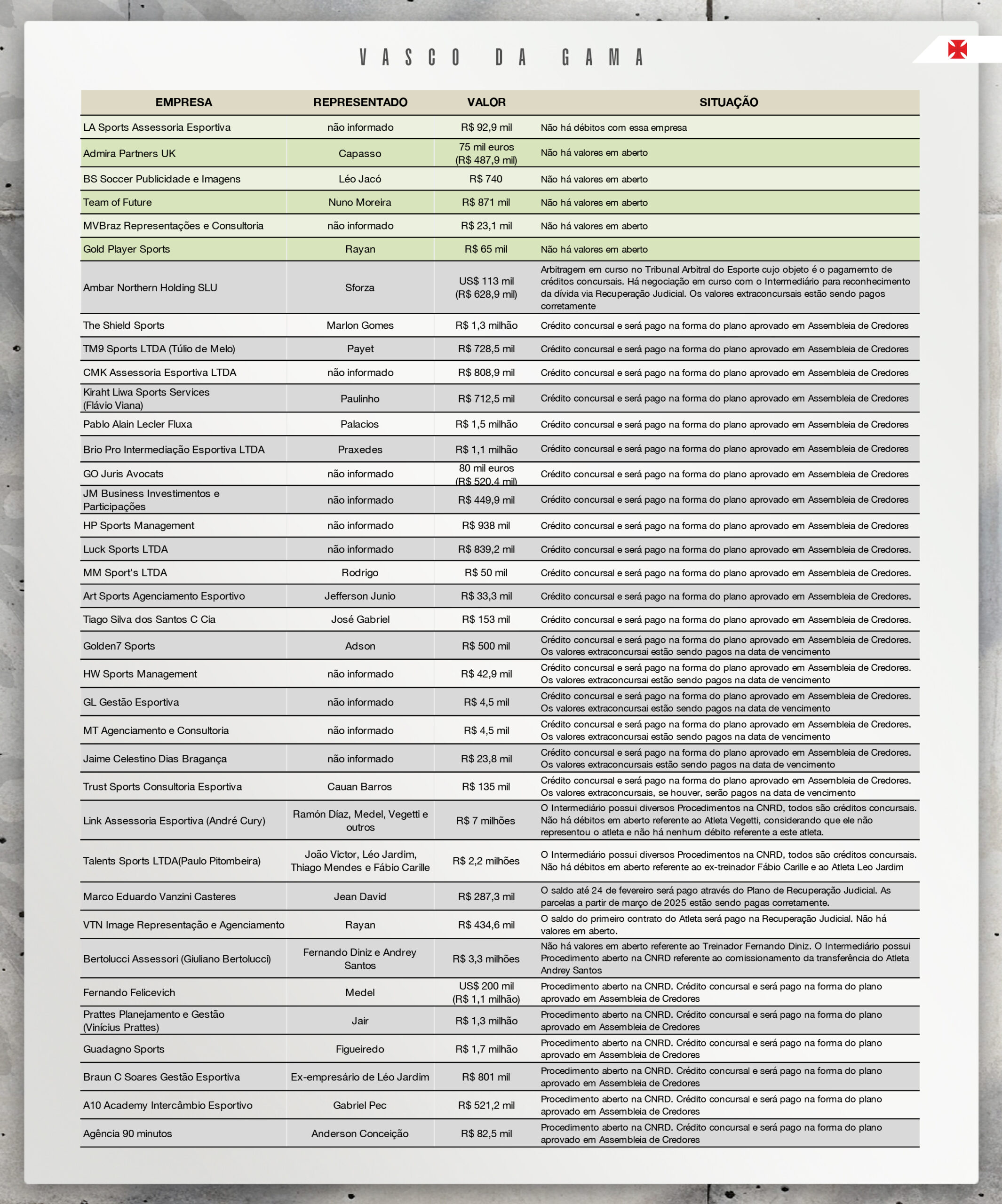 Vasco teria uma dívida superior a R$ 30 milhões em comissões com agentes; Carlos Leite, André Cury e Eduardo Uram estariam entre os principais credores. sábado, 26/07/2025 às 20:32 — Em Últimas notícias