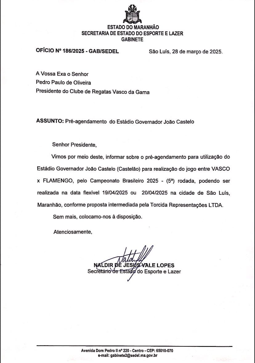 Empresários continuam nos esforços para transferir Vasco x Flamengo para São Luís. sexta-feira, 04/04/2025 às 23:27 — Em Últimas notícias