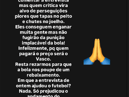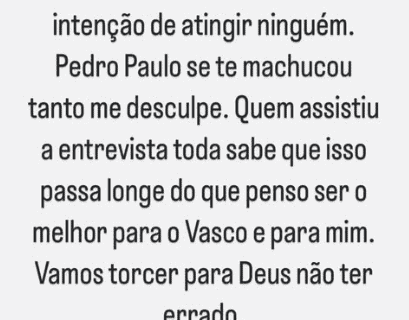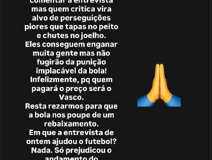Euriquinho: ‘Várias pessoas me solicitando que comente a entrevista, mas aqueles que criticam se tornam alvo de perseguições mais severas do que tapas no peito e chutes no joelho’ sábado, 26/07/2025 às 07:25 — Em Últimas notícias
