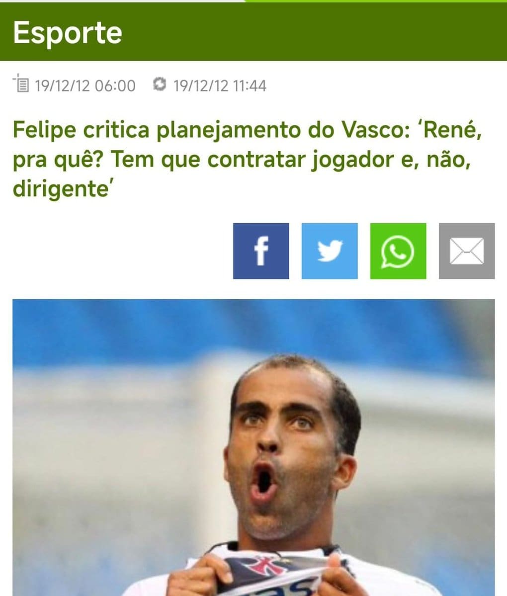 Vascaíno revive crítica de Felipe, ex-jogador do clube, em 2012: ‘É preciso contratar jogadores, e não dirigentes’ quarta-feira, 12/02/2025 às 03:23 — Em Últimas notícias