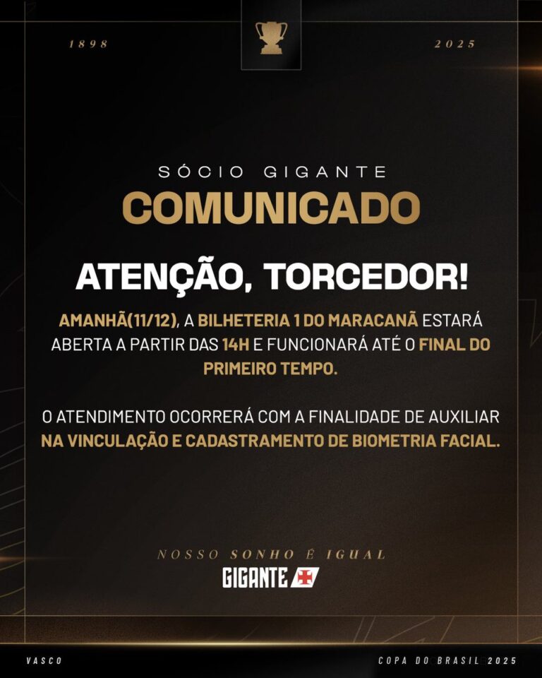 Sócio Gigante avisa sobre o horário de atendimento no Maracanã para o clássico Vasco e Fluminense. quarta-feira, 10/12/2025 às 18:25 — Em Últimas notícias