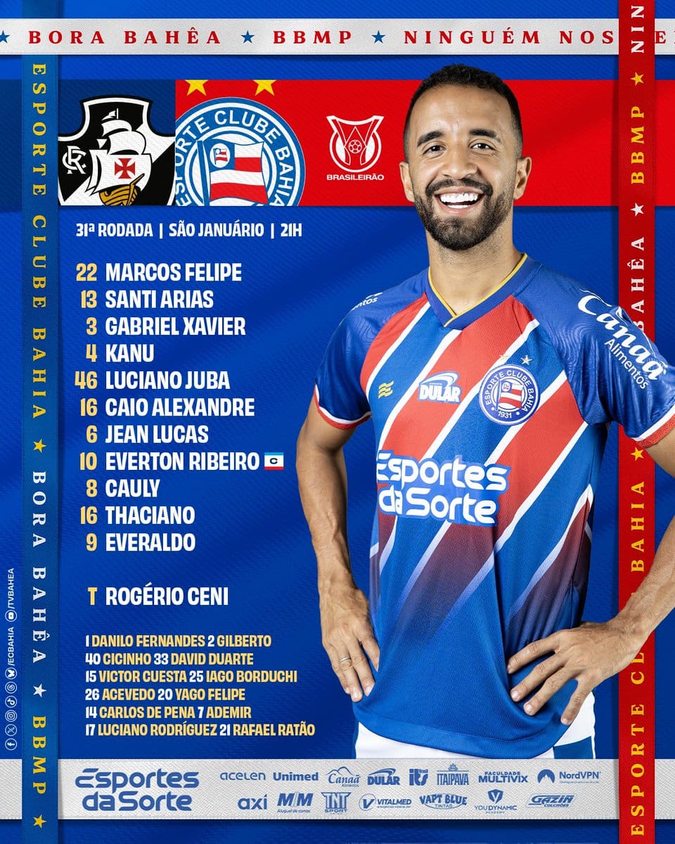Confira a escalação do Bahia para o confronto contra o Vasco; o ex-jogador do Vasco, Gilberto, figura entre as opções do banco. segunda-feira, 28/10/2024 às 19:47 — Em Últimas notícias
