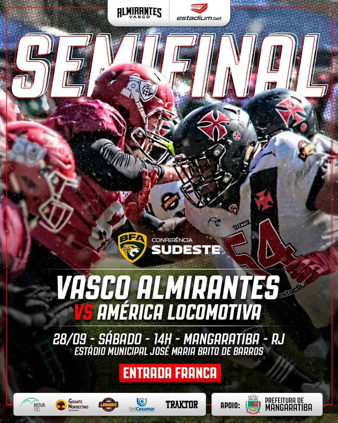Futebol Americano: Neste sábado, às 14h, o Vasco irá enfrentar o América Locomotiva na semifinal da Conferência Sudeste da BFA. sexta-feira, 13/09/2024 às 12:55 — Em Últimas notícias