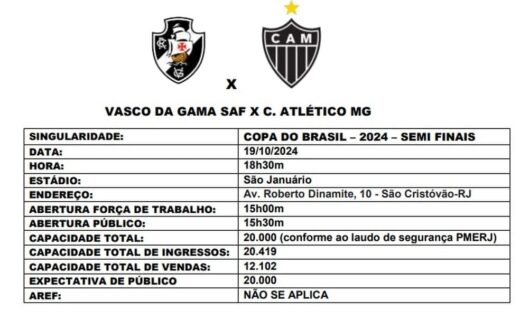 Ata revela que pouco mais de 12 mil bilhetes para Vasco x Atlético-MG foram disponibilizados para venda. sexta-feira, 18/10/2024 às 23:31 — Em Últimas notícias