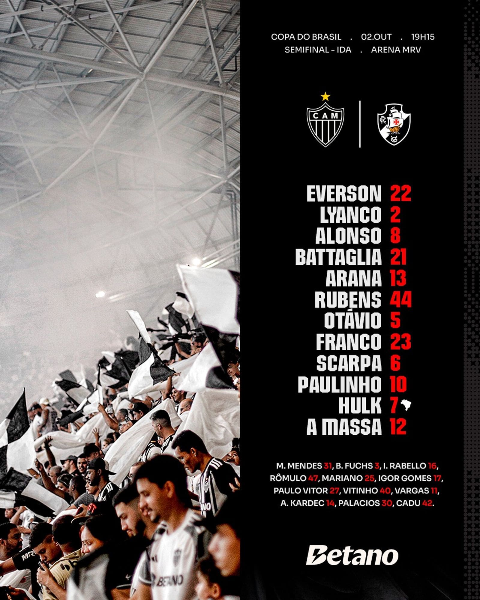 Veja a escalação do Atlético-MG para a partida contra o Vasco; o vascaíno Paulinho é escalado como titular. quarta-feira, 02/10/2024 às 18:25 — Em Últimas notícias