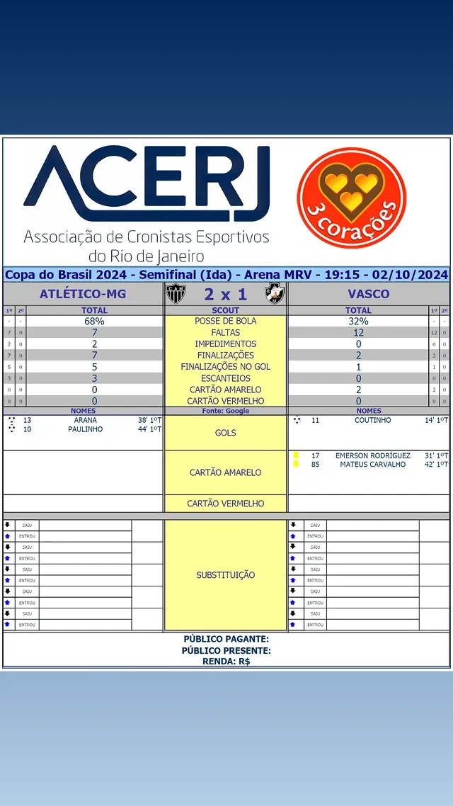 VASCO É DERROTADO PELO ATLÉTICO-MG EM BELO HORIZONTE NO JOGO DE IDA DA SEMIFINAL DA COPA DO BRASIL: 2 A 1 quarta-feira, 02/10/2024 às 21:15 — Em Últimas notícias