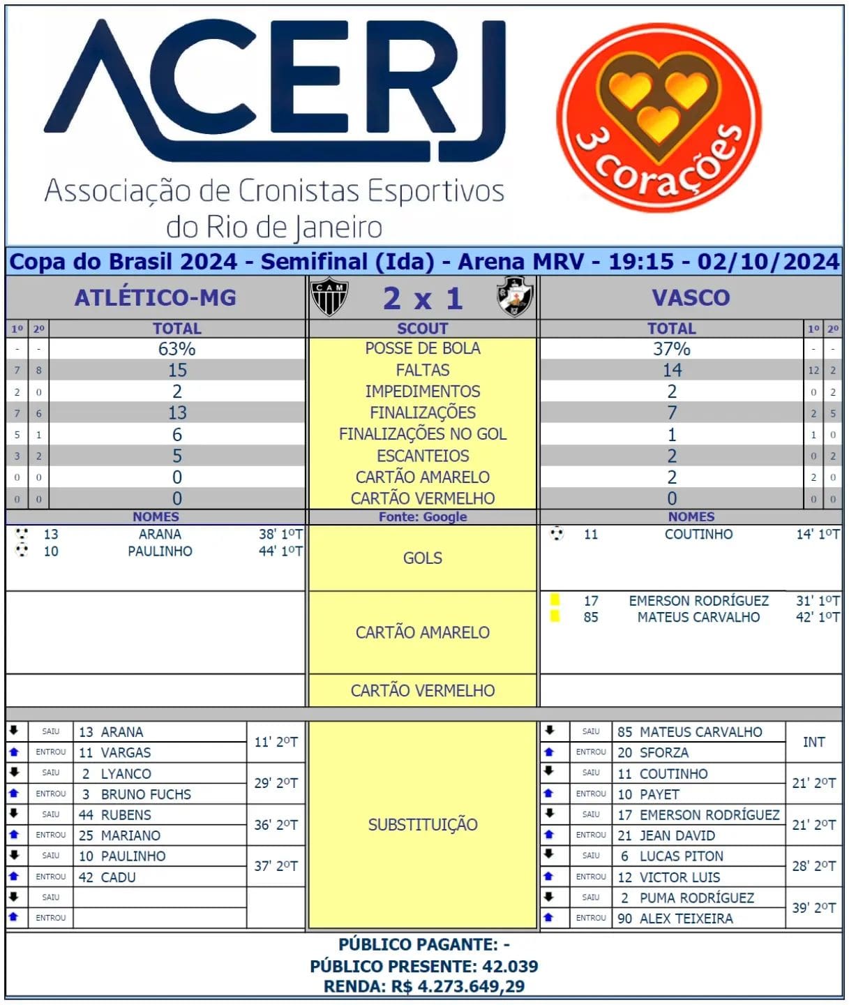 Confira as estatísticas do duelo entre Atlético-MG 2 x 1 Vasco quarta-feira, 02/10/2024 às 21:21 — Em Últimas notícias