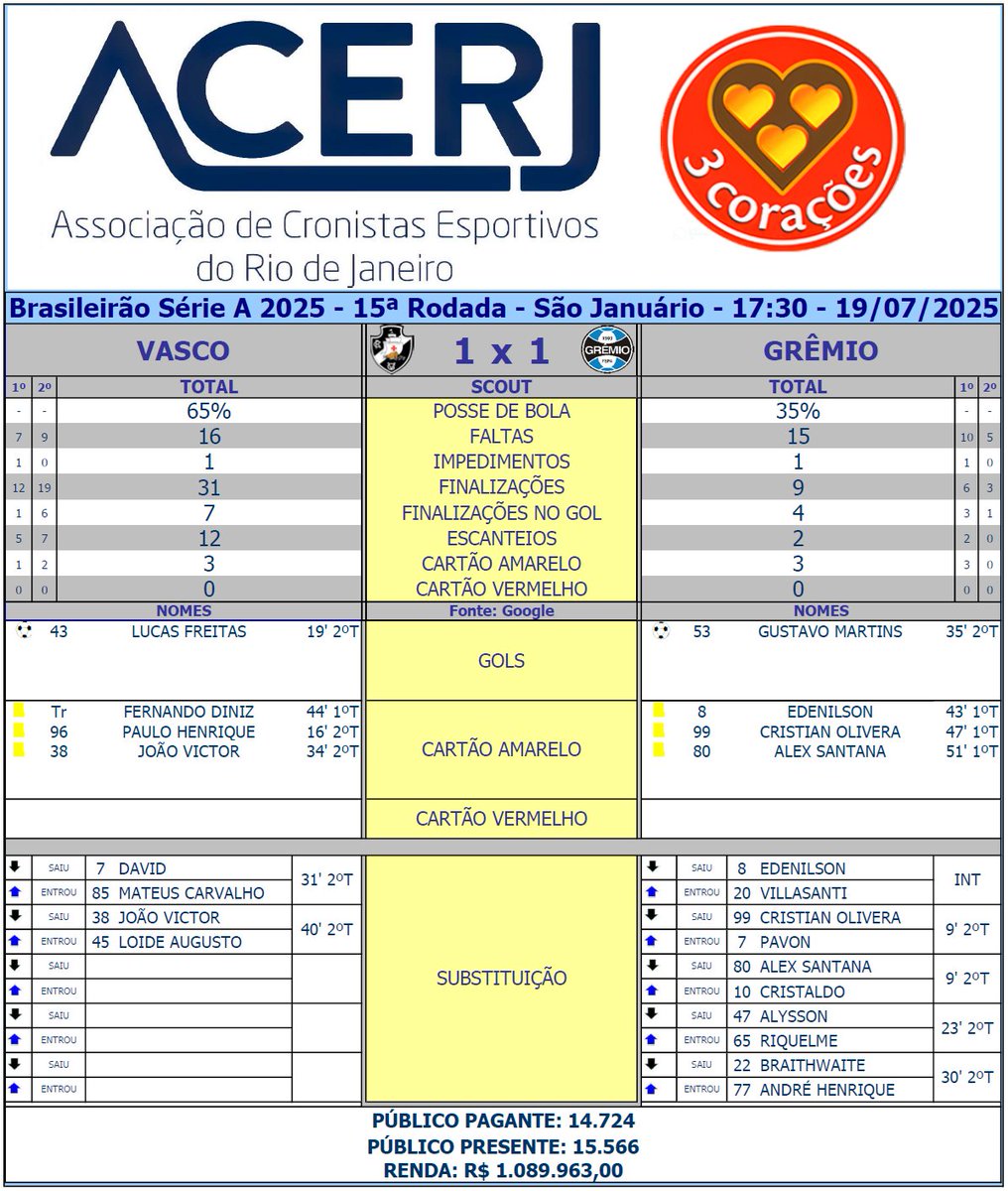 VASCO E GRÊMIO TERMINAM JOGO EM SÃO JANUÁRIO COM O EMPATE DE 1 A 1 sábado, 19/07/2025 às 19:32 — Em Últimas notícias