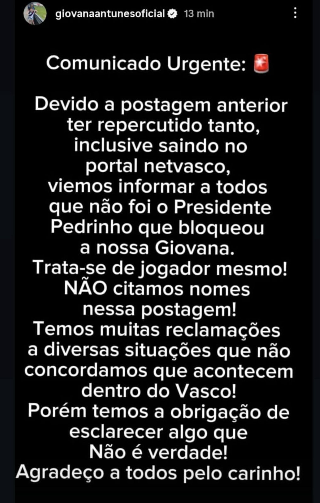 A jovem torcedora Giovana Antunes esclarece que o bloqueio no Instagram não foi de Pedrinho, mas sim de outro jogador. quinta-feira, 17/07/2025 às 10:40 — Em Últimas notícias