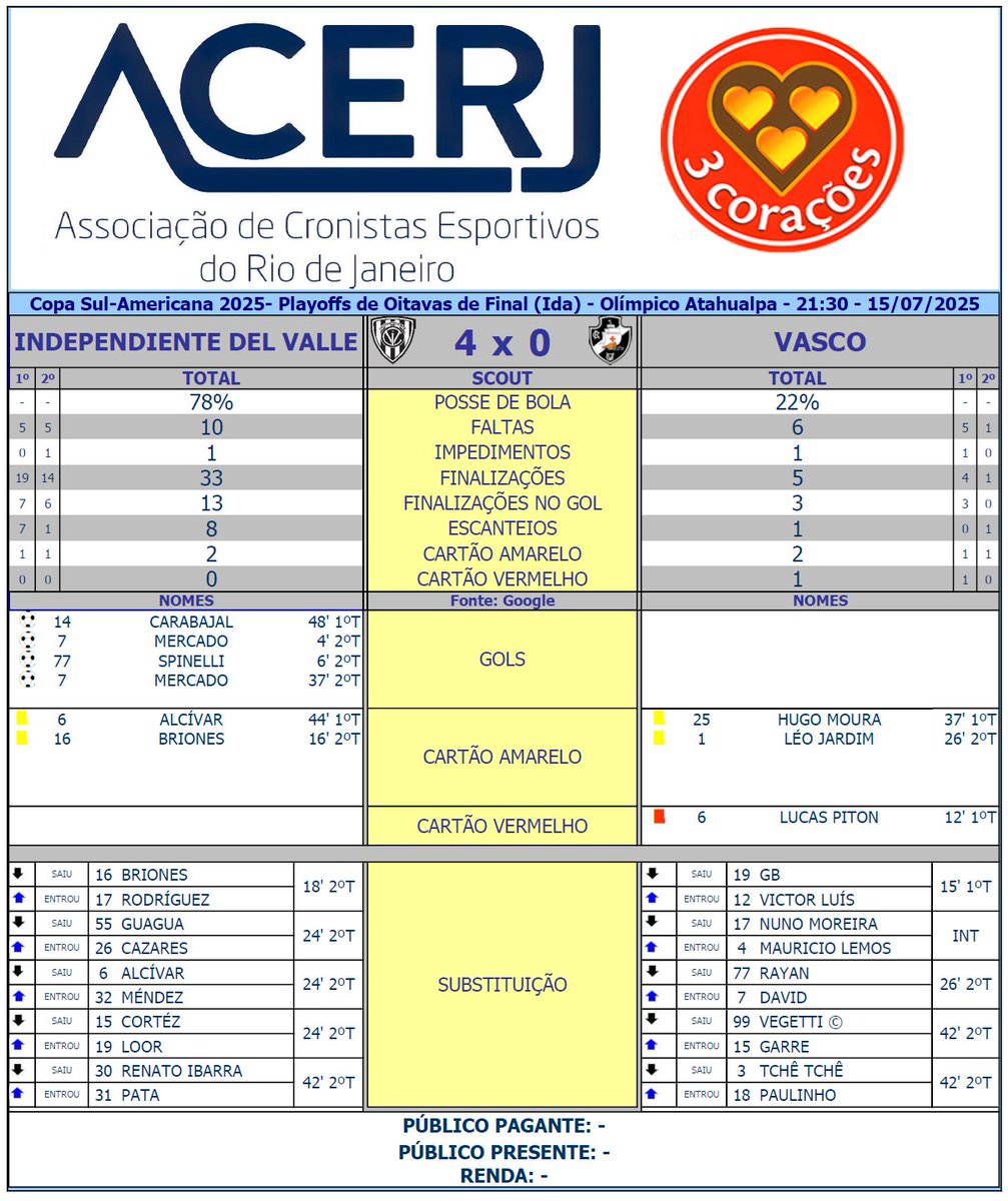 VASCO SOFRE UMA DERROTA PESADA PARA O INDEPENDIENTE DEL VALLE EM QUITO: 4 A 0 terça-feira, 15/07/2025 às 23:29 — Em Destaques