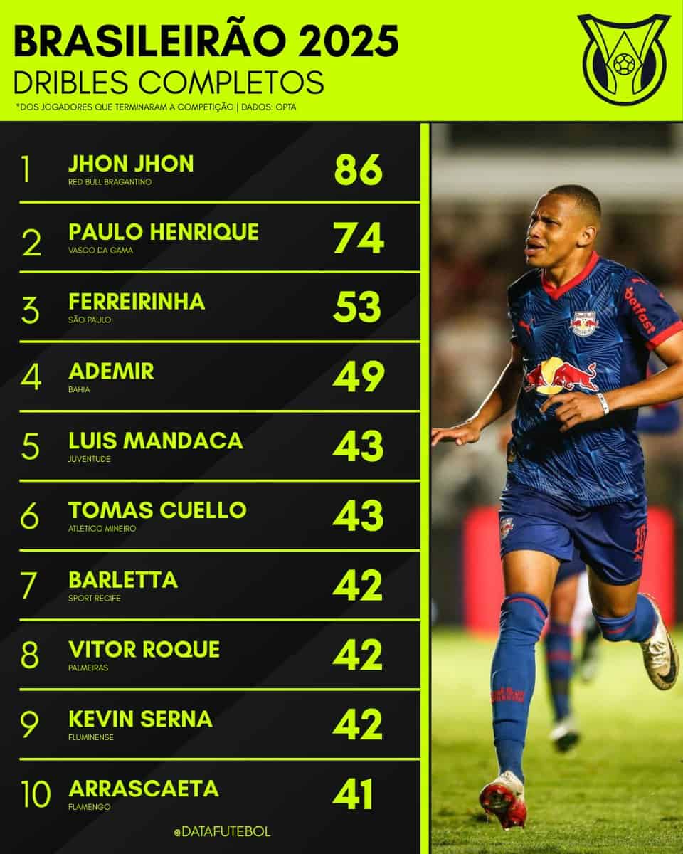 Paulo Henrique ficou em 2º lugar na lista de jogadores com mais dribles completos no Brasileiro segunda-feira, 29/12/2025 às 09:33 — Em Últimas notícias