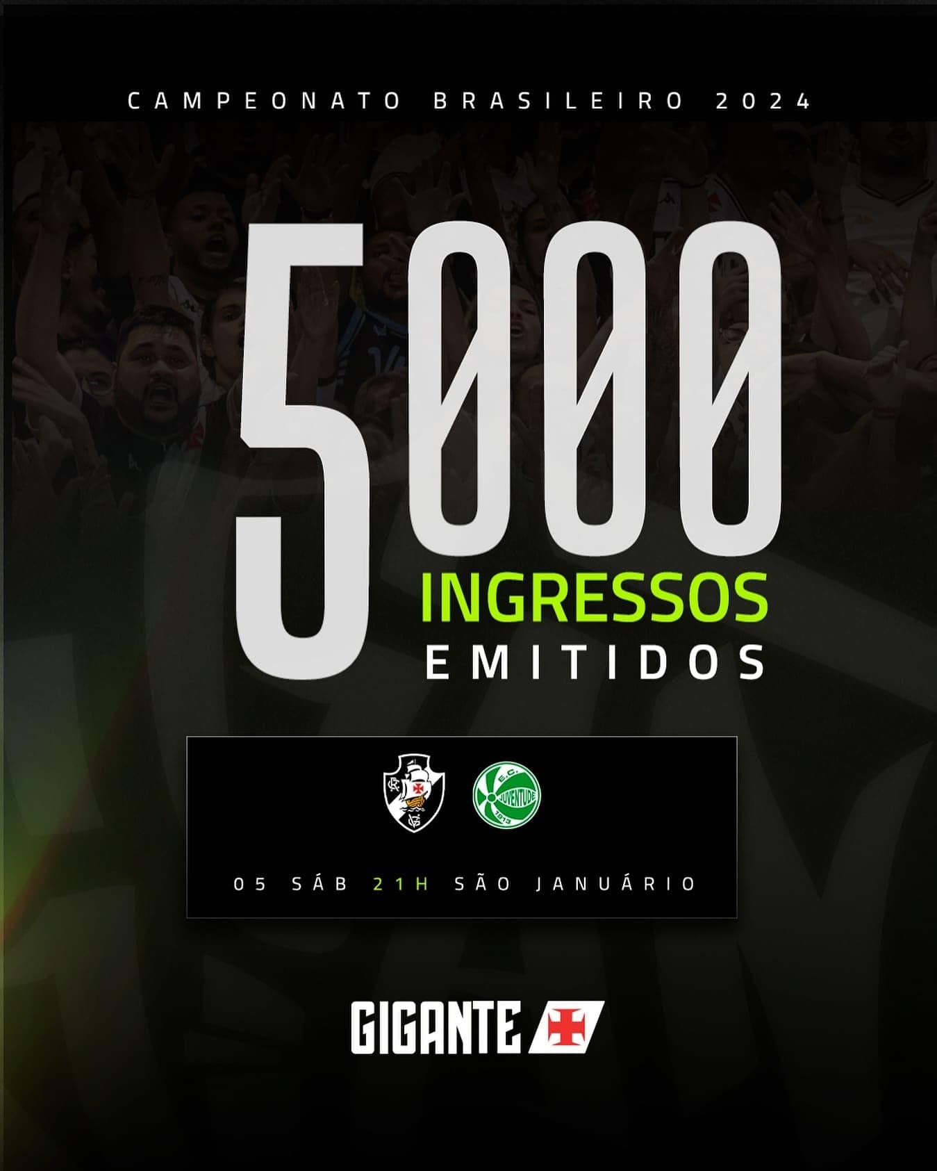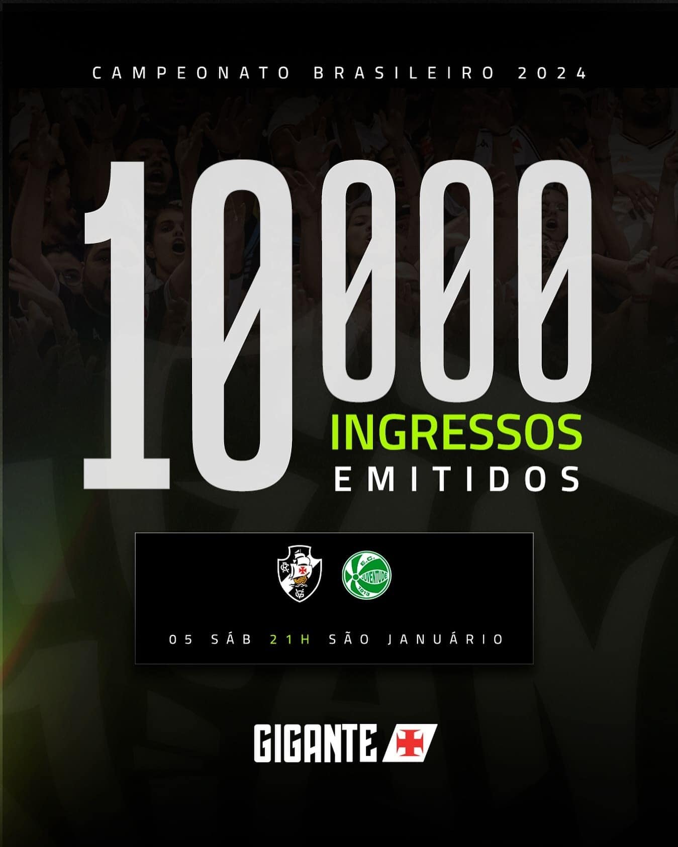 Já foram vendidos 10 mil ingressos para o jogo Vasco x Juventude. terça-feira, 01/10/2024 às 16:30 — Em Últimas notícias
