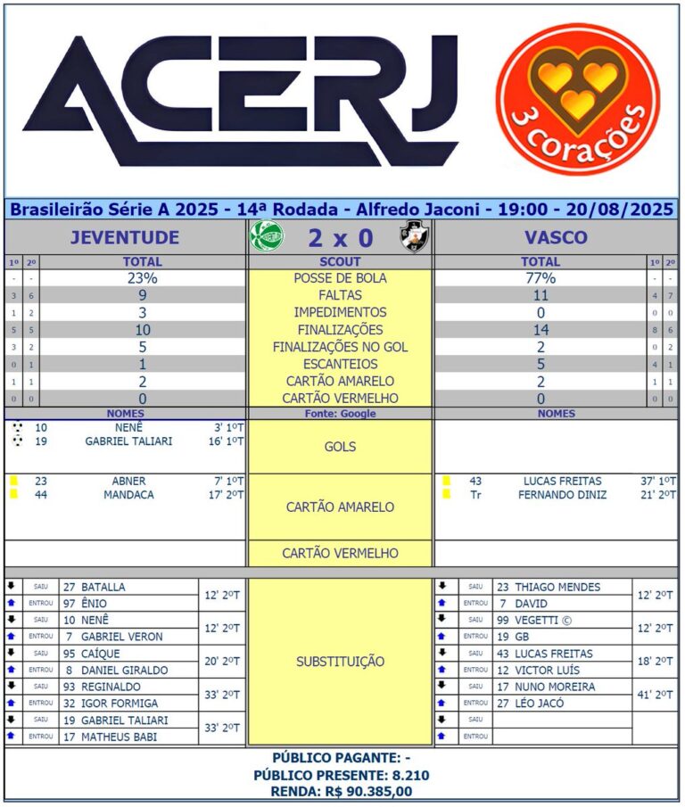 Revesse mantém o Vasco na 16ª posição do Brasileiro, mas aproxima o Juventude. quarta-feira, 20/08/2025 às 21:03 — Em Últimas notícias