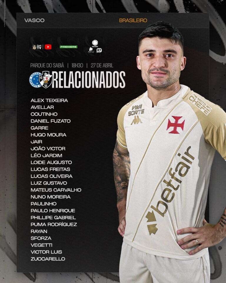 Vasco divulga a lista de convocados para enfrentar o Cruzeiro; Lucas Piton é poupado e não embarca para o jogo.