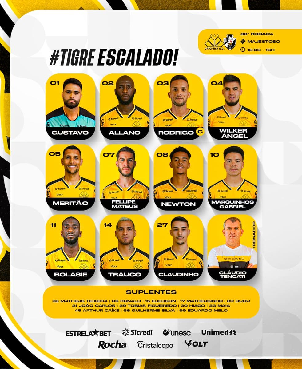 Confira a escalação do Criciúma com Marquinhos Gabriel como titular para o jogo contra o Vasco domingo, 18/08/2024 às 15:10 — Em Últimas notícias