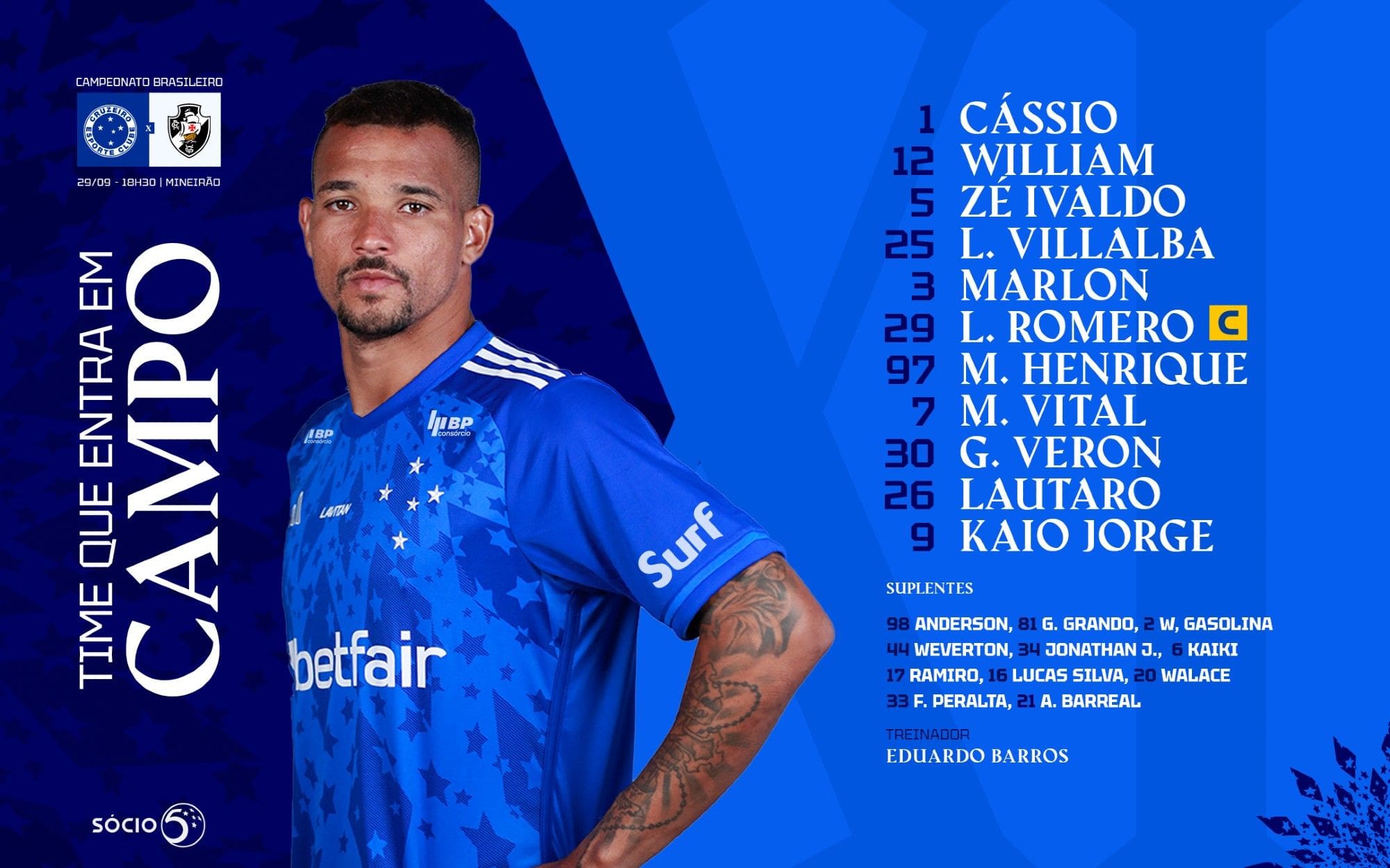 Veja a formação do Cruzeiro para a partida contra o Vasco; o ex-jogador do Vasco, Mateus Vital, será titular. domingo, 29/09/2024 às 17:37 — Em Últimas notícias