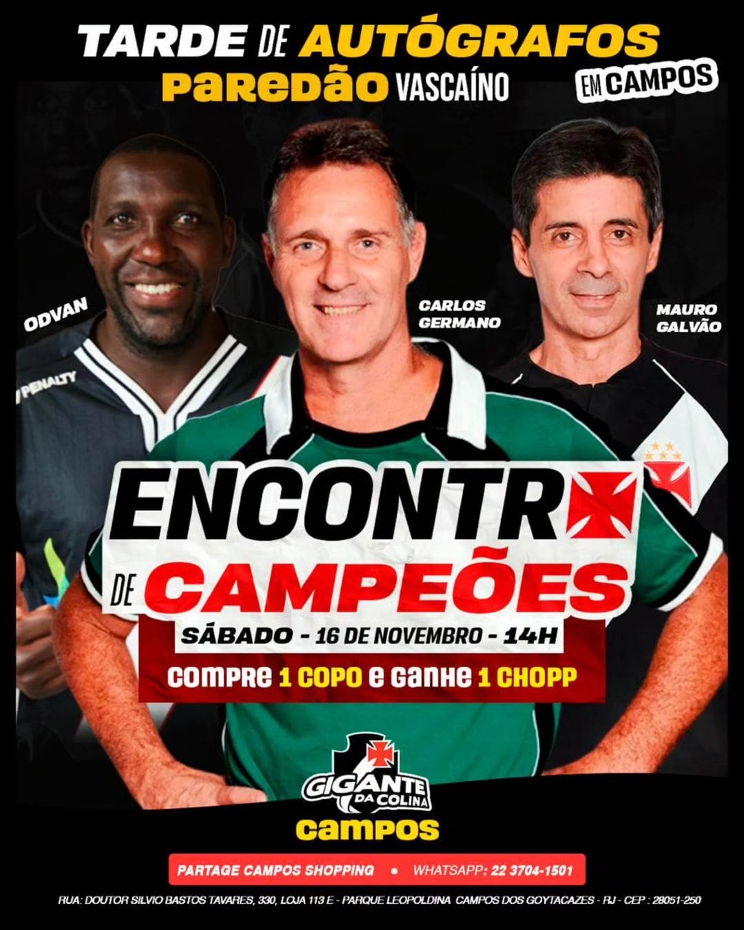 Carlos Germano, Odvan e Mauro Galvão farão uma aparição na loja Gigante da Colina, localizada em Campos, neste sábado, às 14h. terça-feira, 12/11/2024 às 15:43 — Em Últimas notícias