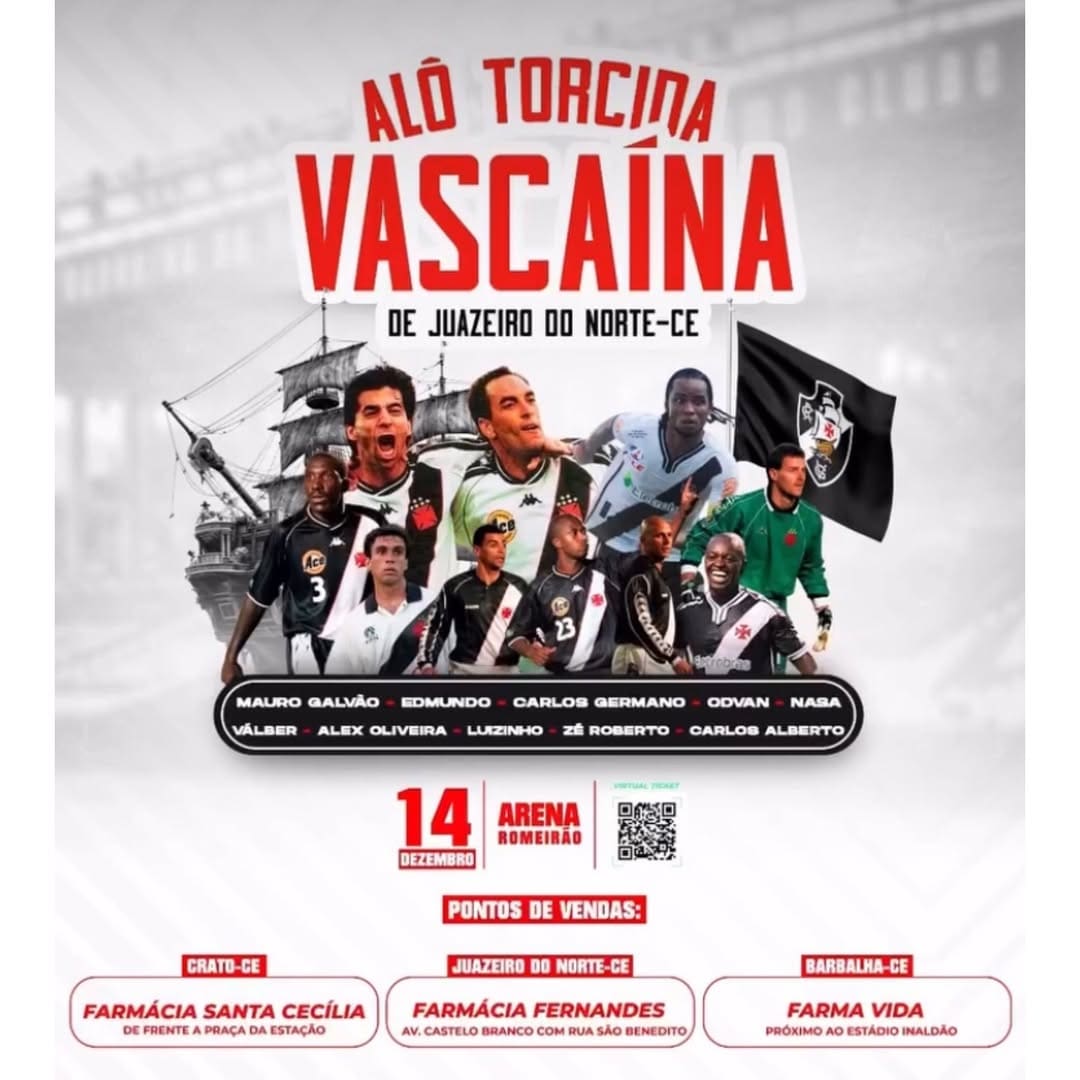 Edmundo, Carlos Germano, Odvan, Mauro Galvão, Nasa e Luisinho participarão de um jogo beneficente em Juazeiro do Norte no dia 14 de dezembro. domingo, 08/12/2024 às 03:41 — Em Últimas notícias