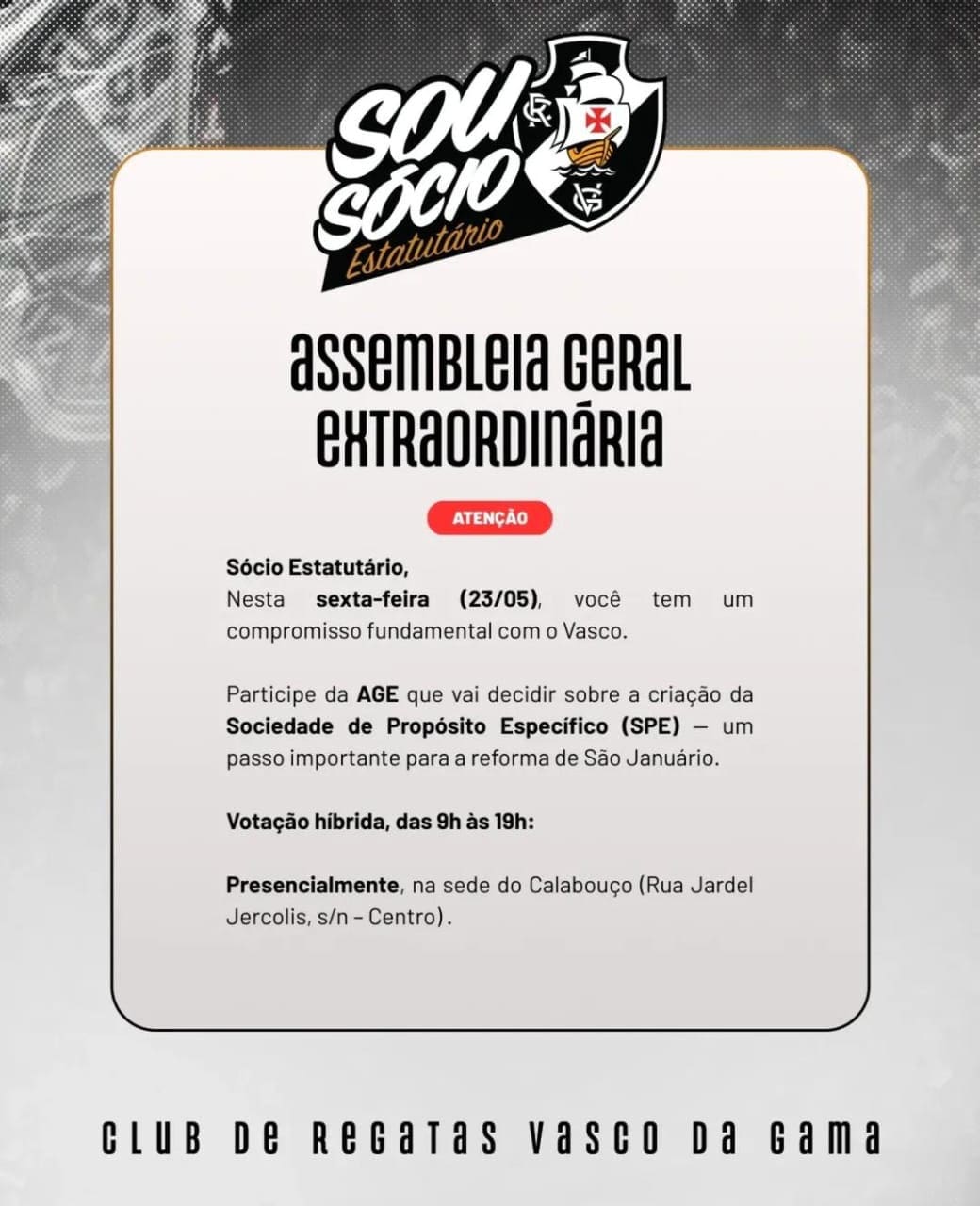 Vasco realiza AGE nesta sexta-feira das 9h às 19h para deliberar sobre a criação de SPE para a reforma de São Januário. sexta-feira, 23/05/2025 às 03:43 — Em Últimas notícias
