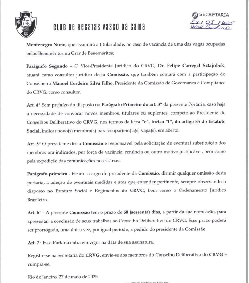 Presidente do Conselho Deliberativo estabelece comissão para modificar o estatuto do Vasco quinta-feira, 29/05/2025 às 20:16 — Em Últimas notícias