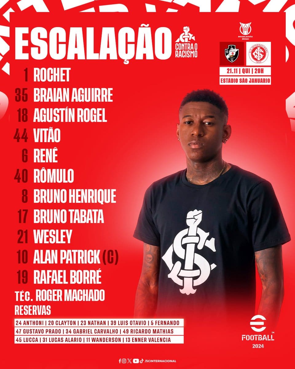 Veja a formação do Internacional para a partida contra o Vasco; o ex-jogador do Vasco, Nathan, está entre as opções no banco de reservas. quinta-feira, 21/11/2024 às 19:10 — Em Últimas notícias