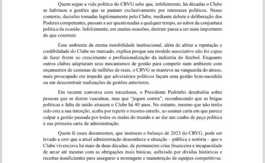 Jorge Salgado responde às críticas de Pedrinho em carta sobre o balanço do CRVG sexta-feira, 06/09/2024 às 18:45 — Em Últimas notícias