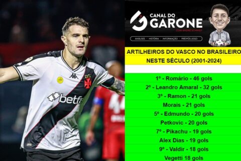 Vegetti entra para o Top 10 dos goleadores do Vasco neste século! quinta-feira, 29/08/2024 às 09:43 — Em Últimas notícias