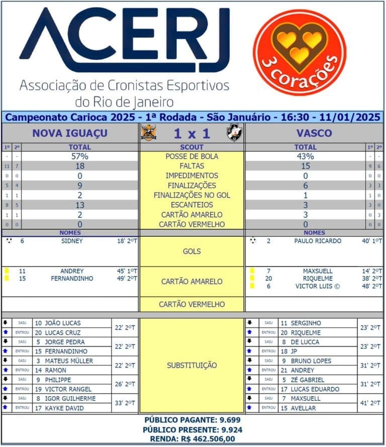 Confira as estatísticas do jogo Nova Iguaçu 1 x 1 Vasco sábado, 11/01/2025 às 18:41 — Em Últimas notícias