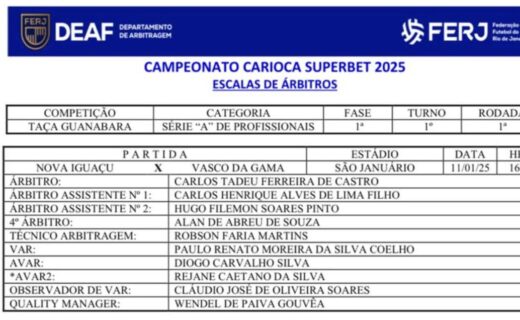 Ferj confirma partida Nova Iguaçu x Vasco para o dia 11/01 às 16h30 no estádio de São Januário. sexta-feira, 03/01/2025 às 00:20 — Em Últimas notícias