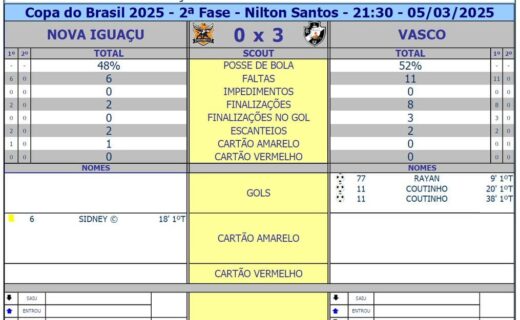 Veja os dados do 1º tempo de Nova Iguaçu x Vasco quarta-feira, 05/03/2025 às 22:27 — Em Últimas notícias