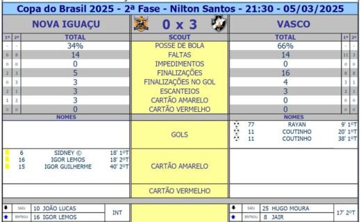 Confira as estatísticas do jogo Nova Iguaçu 0 x 3 Vasco quarta-feira, 05/03/2025 às 23:29 — Em Últimas notícias