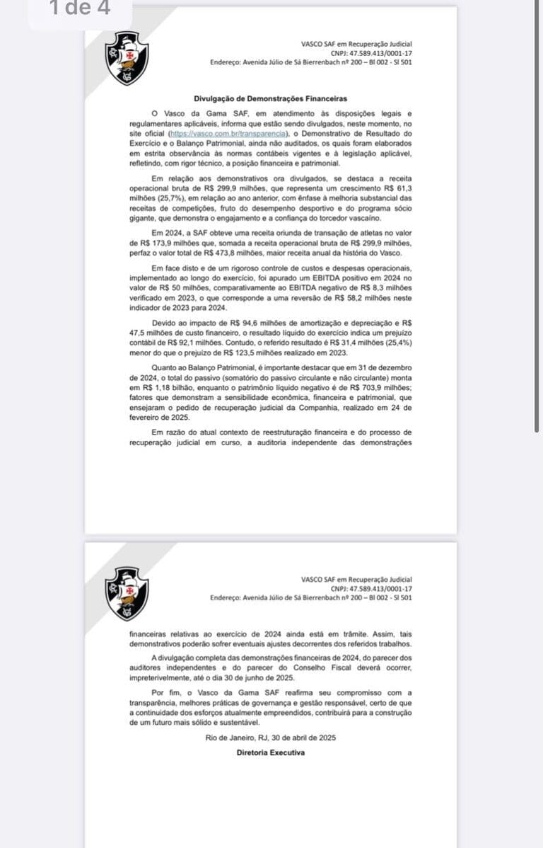 Vasco SAF apresenta balanço de 2024! Não perca os principais detalhes e perspectivas financeiras do clube. Confira agora!