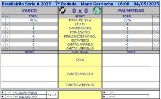Intervalo no Mané Garrincha; Vasco e Palmeiras seguem em 0 a 0 domingo, 04/05/2025 às 16:51 — Em Últimas notícias