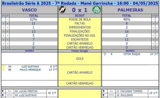 Confira as estatísticas do primeiro tempo entre Vasco e Palmeiras. domingo, 04/05/2025 às 16:56 — Em Últimas notícias