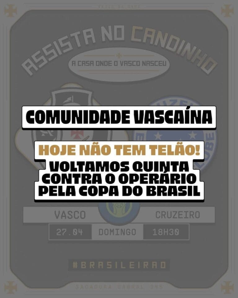Candinho comunica que não haverá telão no jogo Cruzeiro x Vasco, mas estará presente em Operário-PR x Vasco e Vasco x Palmeiras. domingo, 27/04/2025 às 13:12 — Em Últimas notícias
