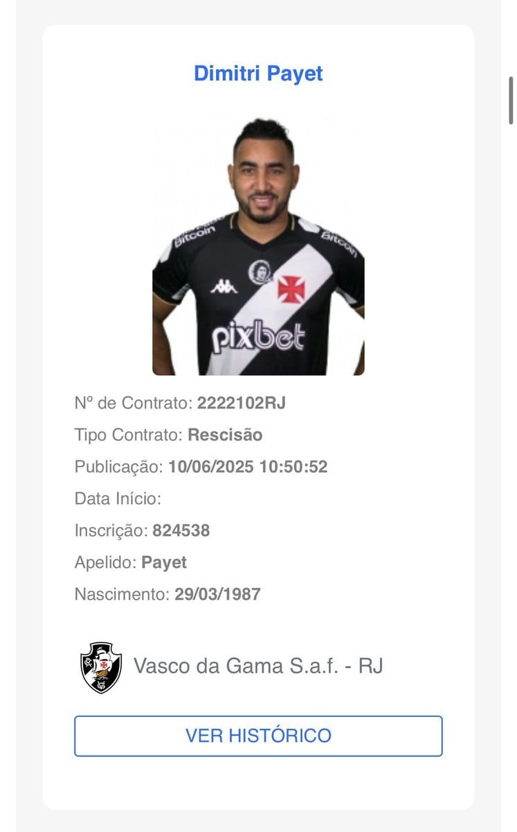 Vasco anuncia acordo amigável para rescisão antecipada do contrato com Payet e agradece ao atleta: ‘Merci’ segunda-feira, 09/06/2025 às 12:32 — Em Últimas notícias