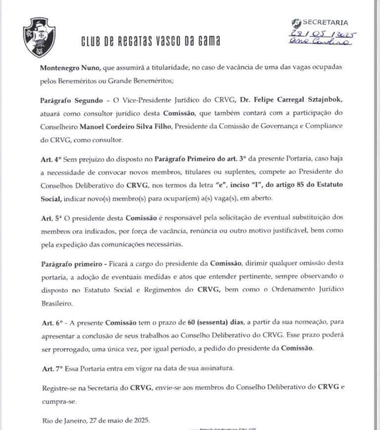 Presidente do Conselho Deliberativo estabelece comissão para modificar o estatuto do Vasco quinta-feira, 29/05/2025 às 20:16 — Em Últimas notícias