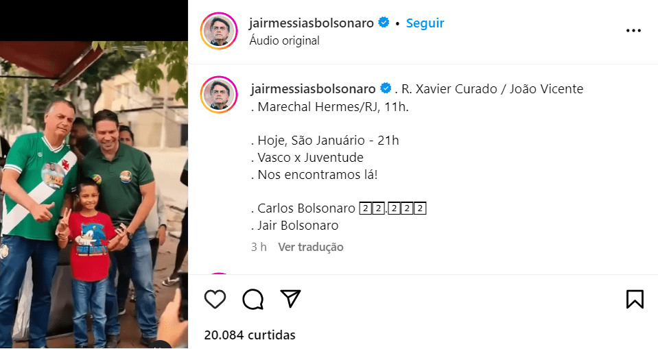 Ex-presidente Bolsonaro afirma que estará presente no jogo Vasco x Juventude: ‘Nos vemos lá!’ sábado, 05/10/2024 às 15:25 — Em Últimas notícias