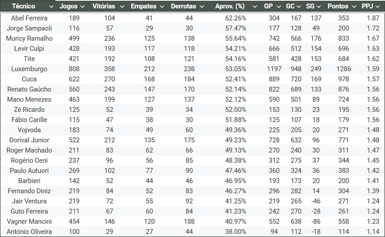 Aproveitamento dos técnicos com mais de 100 jogos pelo Campeonato Brasileiro: uma comparação detalhada quarta-feira, 24/12/2025 às 11:33 — Em Últimas notícias