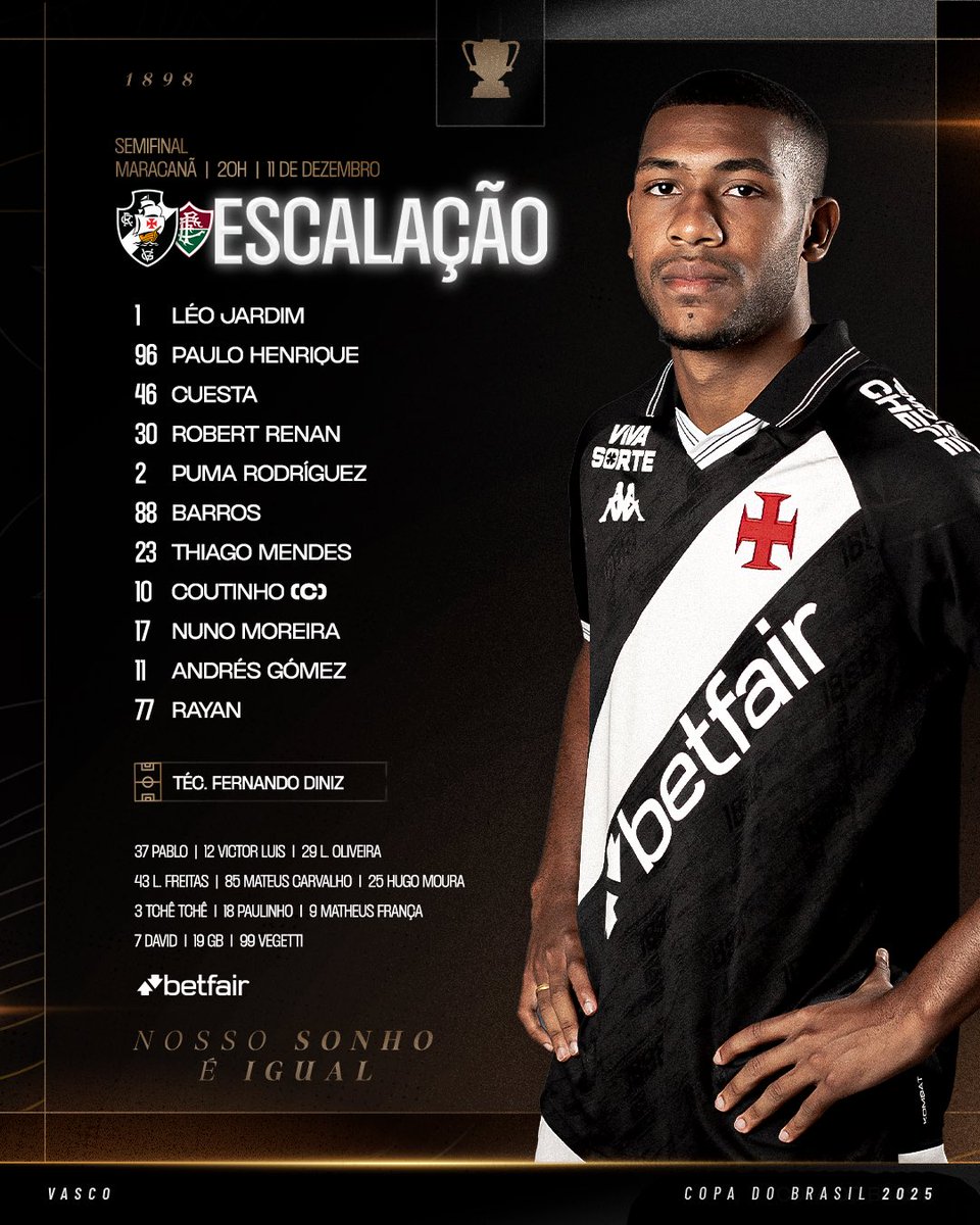 Veja a escalação do Vasco para o jogo contra o Fluminense: Puma ocupa a posição de Piton. quinta-feira, 11/12/2025 às 19:14 — Em Últimas notícias