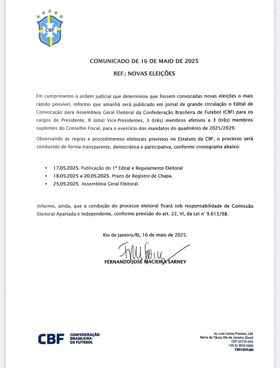 Votação para presidente da CBF está agendada para 25 de maio sábado, 17/05/2025 às 00:59 — Em Últimas notícias