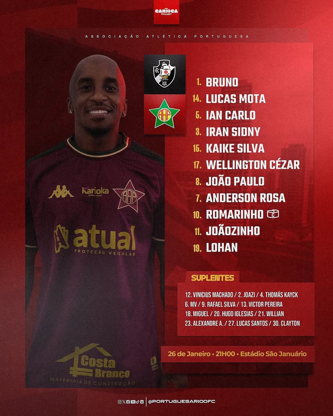 Veja a formação da Portuguesa para a partida contra o Vasco; os ex-jogadores do Vasco, Rafael Silva e Lucas Santos, começam no banco de reservas. domingo, 26/01/2025 às 20:12 — Em Últimas notícias