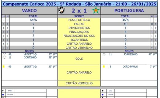 Intervalo em São Januário; Vasco lidera a Portuguesa com 2 a 1; confira os gols de Vegetti e Coutinho. domingo, 26/01/2025 às 21:51 — Em Últimas notícias