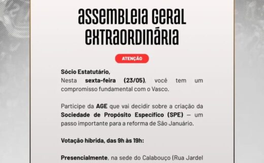 AGE sobre a formação da SPE da reforma de São Januário acontecerá no dia 23 de maio em formato híbrido. sábado, 10/05/2025 às 17:15 — Em Últimas notícias
