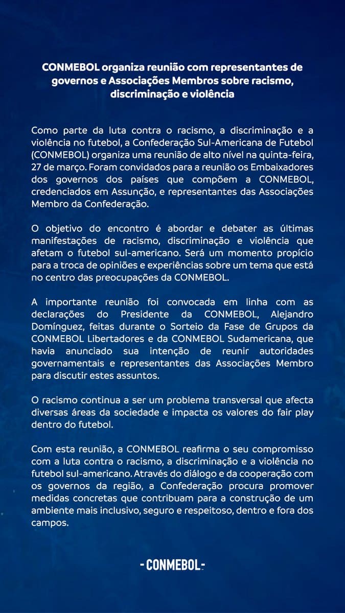Conmebol realizará encontro para debater o racismo na próxima quinta-feira. quinta-feira, 20/03/2025 às 13:05 — Em Últimas notícias