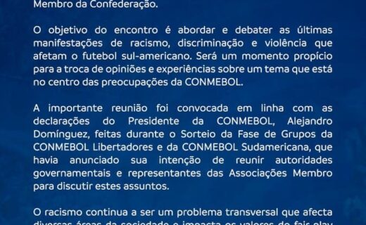Conmebol realizará encontro para debater o racismo na próxima quinta-feira. quinta-feira, 20/03/2025 às 13:05 — Em Últimas notícias