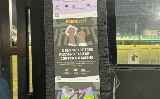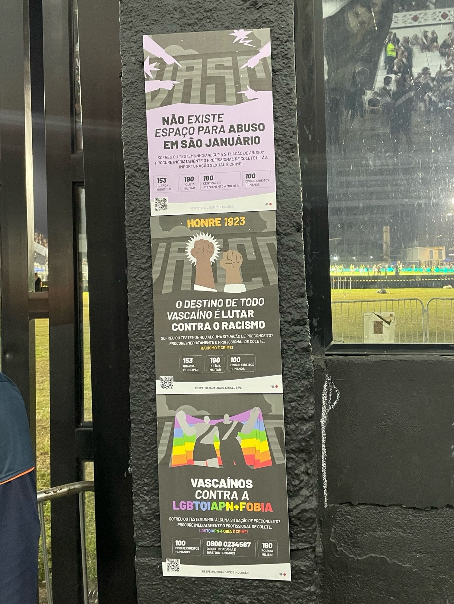Foto exibe cartazes denunciando assédio, racismo e LGBTfobia em São Januário sábado, 05/10/2024 às 22:03 — Em Últimas notícias